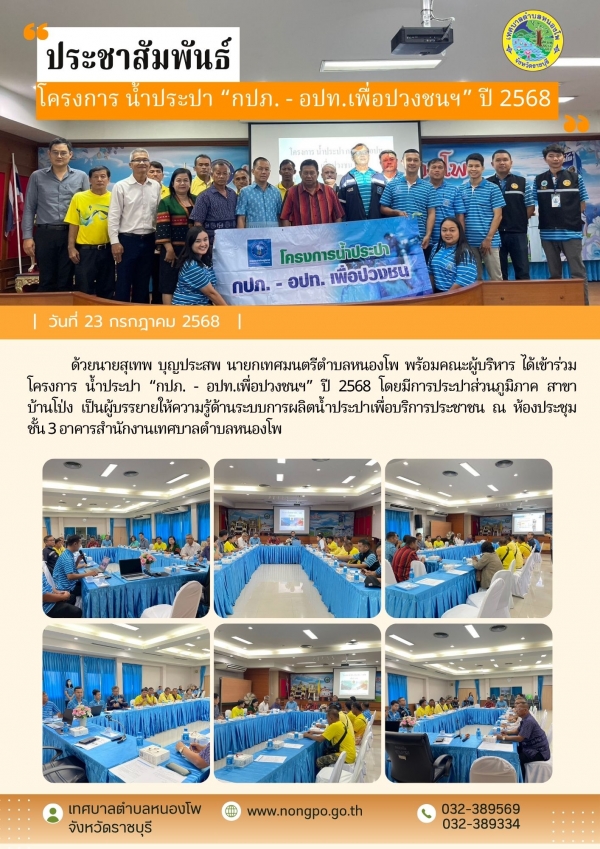 การประปาส่วนภูมิภาค สาขาบ้านโป่ง ร่วมกับเทศบาลตำบลหนองโพ จัดกิจกรรมโครงการ "น้ำประปา กปภ. - อปท." เพื่อปวงชน ปี 2568 จัดขึ้นเมื่อวันที่ 23 กรกฎาคม 2568 ณ ห้องประชุมชั้น 3 อาคารสำนักงานเทศบาลตำบลหนองโพ วัตถุประสงในการจัดกิจกรรม เพื่อให้ความรู้เกี่ยวกับระบบผลิตน้ำประปาในรูปแบบต่างๆ ให้กับผู้บริหารและพนักงานเทศบาลตำบลหนองโพ โดยมีการให้ความรู้ทั้งรูปแบบระบบประปาแบบผิวดิน และระบบประปาแบบดาดาล และร่วมปรึกษาและตอบคำถามเกี่ยวกับระบบผลิตน้ำประปาของเทศบาลตำบลหนองโพ รวมถึงการแก้ไขปัญหาต่างๆ และแนวทางการพัฒนาระบบผลิตน้ำประปา