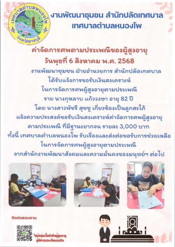 การขอรับเงินสงเคราะห์ในการจัดการศพผู้สูงอายุตามประเพณี ราย นางกุหลาบ แก้ววงษา อายุ 82 ปี