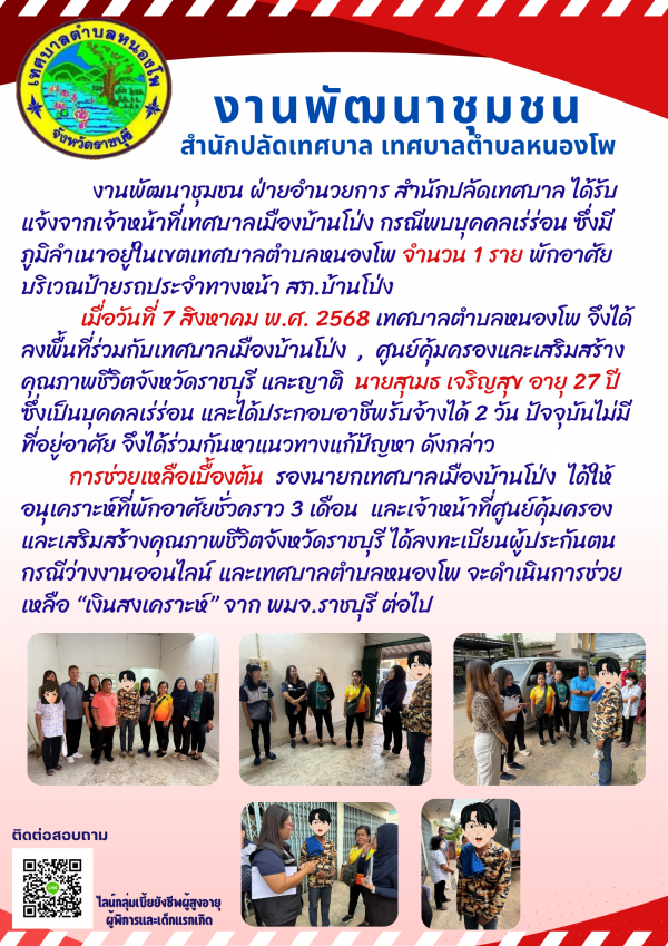 การลงพื้นที่คนเร่ร่อน นายสุเมธ เจริญสุข กรณี พบบุคคลเร่ร่อนซึ่งมีภูมิลำเนาอยู่ในเขตเทศบาลตำบลหนองโพ จำนวน 1 ราย พักอาศัยบริเวณป้านรถประจำทางบริเวณหน้า สภ.บ้านโป่ง
