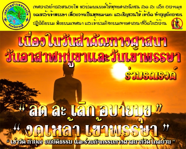 เทศบาลตำบลหนองโพ ขอเชิญชวนให้ เด็ก เยาวชน และประชาชน ร่วมกันสืบสานและตระหนักถึงวันสำคัญของวันอาสาฬหบูชาและวันเข้าพรรษา ทำบุญ ตักบาตร ปฏิบัติธรรม ฟังธรรมเทศนา เจริญภาวนา รักษาศีล งดเหล้าเข้าพรรษา ลด ละ เลิก อบายมุข และเข้าร่วมกิจกรรมทางพุทธศาสนา เพื่อถวายเป็นพุทธบูชา ในวันสำคัญทางศาสนา