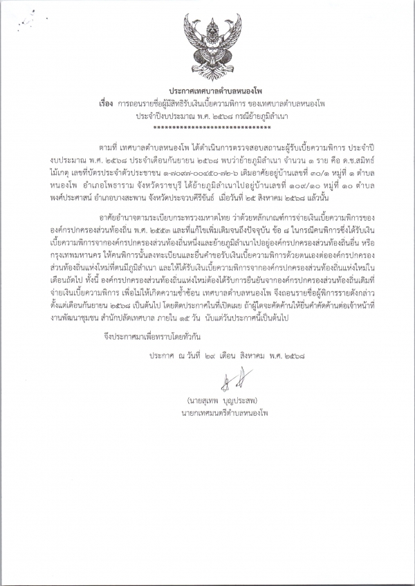 การถอนรายชื่อผู้มีสิทธิรับเงินเบี้ยความพิการของเทศบาลตำบลหนองโพ ประจำปีงบประมาณ 2568 (กรณีย้ายภูมลำเนา