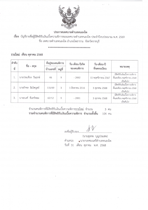 ประกาศบัญชีรายชื่อผู้มีสิทธิรับเงินเบี้ยความพิการ ประจำปีงบประมาณ 2569 ประจำเดือน ตุลาคม 2568