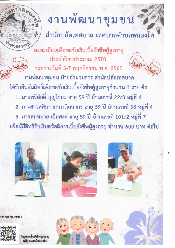 ลงทะเบียนเพื่อขอรับเงินเบี้ยยังชีพผู้สูงอายุ ประจำปีงบประมาณ พ.ศ.2570(ตั้งแต่ 3-7 พฤศจิกายน พ.ศ. 2568)