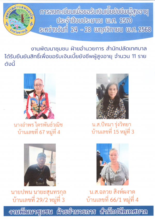 ลงทะเบียนเพื่อขอรับเงินเบี้ยยังชีพผู้สูงอายุ ประจำปีงบประมาณ พ.ศ.2570 (ตั้งแต่วันที่ 24-28 พฤศจิกายน พ.ศ. 2568)