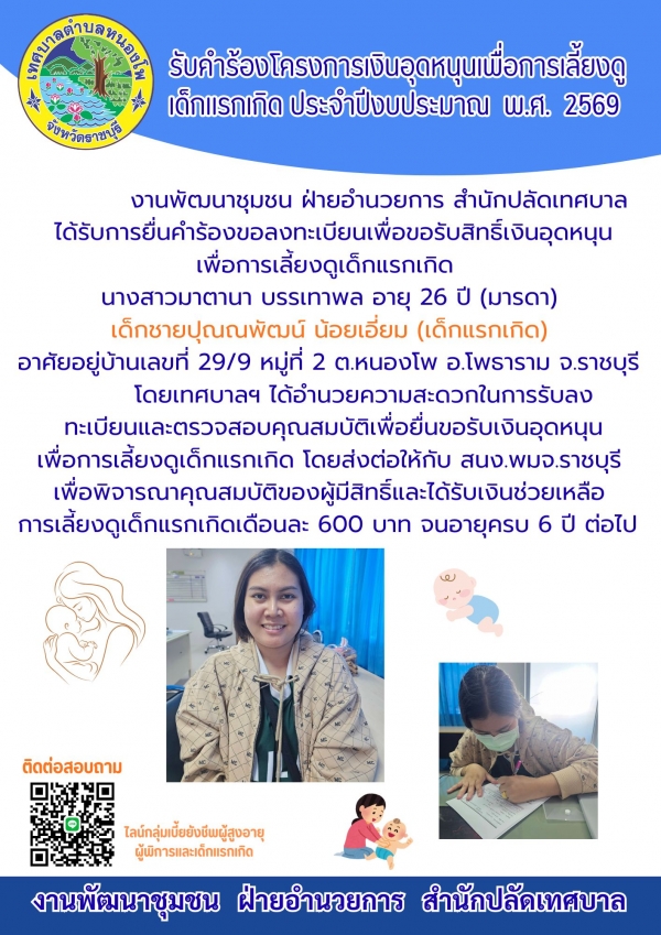รับคำร้องโครงการเงินอุดหนุนเพื่อการเลี้ยงดูเด็กแรกเกิด ประจำปีงบประมาณ พ.ศ. 2569