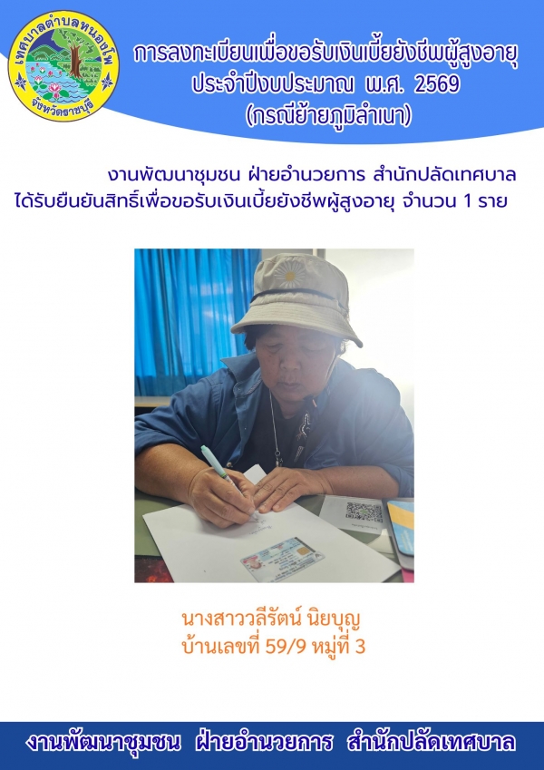 การลงทะเบียนเพื่อขอรับเงินเบี้ยยังชีพผู้สูงอายุ ประจำปีงบประมาณ พ.ศ. 2569 กรณีย้ายภูมิลำเนา
