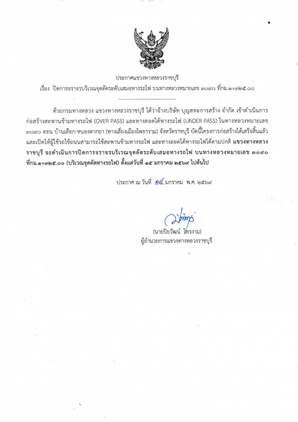 แขวงทางหลวงราชบุรี ประชาสัมพันธ์ปิดการจราจร บริเวณจุดตัดระดับเสมอทางรถไฟ บนหลวงหลวงหมายเลข 3090 ที่กม.1+325.00