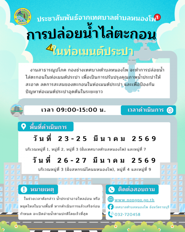 กองช่างเทศบาลตำบลหนองโพ ขอประชาสัมพันธ์ เรื่อง การปล่อยน้ำไล่ตะกอนในท่อเมนต์ประปา