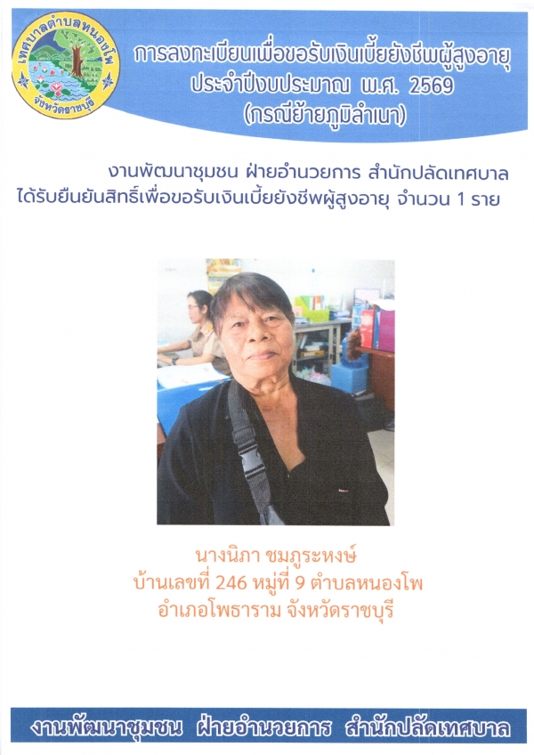 ลงทะเบียนเพื่อขอรับเงินเบี้ยยังชีพผู้สูงอายุ ประจำปีงบประมาณ 2569 รายนางนิภา ชมภูระหงษ์ อายุ 68 ปี