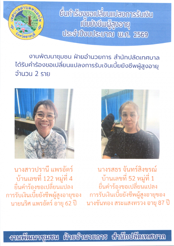 ยื่นคำร้องขอเปลี่ยนแปลงการรับเงินเบี้ยยังชีพผู้สูงอายุ จำนวน 2 ราย 1)นายนริศ แพรอัตร์ 2)นางขันทอง สระแสงทรวง