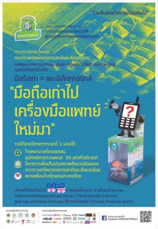 กระทรวงมหาดไทยขอรับบริจาคมือถือเก่า ทุกรุ่น ทุกสภาพ ทุกยี่ห้อ เพื่อลดอันตรายจากขยะอิเล็กทรอนิกส์ในครัวเรือน โดยรายได้จากการรีไซเคิลที่ถูกต้องตามมาตรฐานสากล จะถูกนำไปช่วยโรงพยาบาลที่ขาดแคลน 30 แห่งทั่วประเทศ