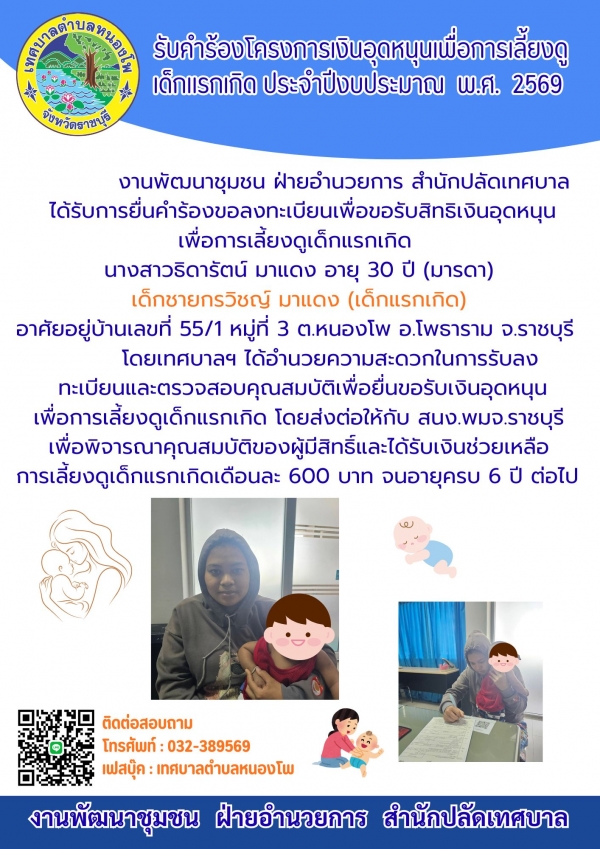 รับคำร้องโครงการเงินอุดหนุนเพื่อการเลี้ยงดูเด็กแรกเกิด ประจำปีงบประมาณ พ.ศ. 2569 นางสาวธิดารัตน์ มาแดง และเด็กชายกรวิชญ์ มาแดง
