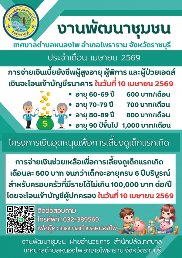 กำหนดโอนเงิน เงินเบี้ยเลี้ยงยังชีพผู้สูงอายุ เงินเบี้ยผู้พิการและเงินอุดหนุนเด็กแรกเกิด ประจำเดือน เมษายน พ.ศ. 2569