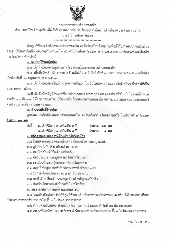 ประกาศรับสมัครเด็กปฐมวัยเพื่อเข้ารับการพัฒนาก่อนวัยเรียนของศูนย์พัฒนาเด็กเล็กเทศบาลตำบลหนองโพ ประจำปีการศึกษา 2563