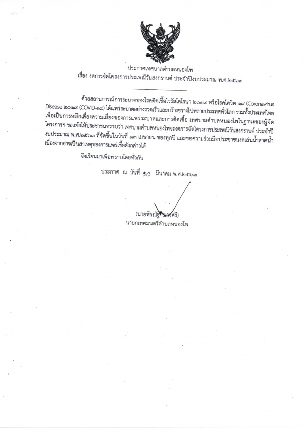 ประกาศ เรื่อง งดการจัดโครงการประเพณีวันสงกรานต์ ประจำปีงบประมาณ พ.ศ.2563