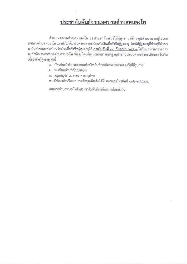 เทศบาลตำบลหนองโพ ขอประชาสัมพันธ์ให้ผู้สูงอายุที่ย้ายภูมิลำเนามาอยู่ในเขตเทศบาลตำบลหนองโพ และยังไม่ได้มายื่นคำขอลงทะเบียนรับเงินเบี้ยยังชีพผู้สูงอายุ