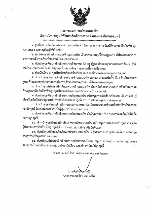ประกาศเทศบาลตำบลหนองโพ เรื่อง นโยบายศูนย์พัฒนาเด็กเล็กเทศบาลตำบลหนองโพปลอดบุหรี่