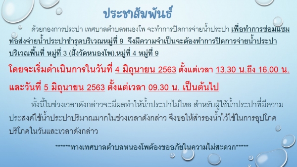 ด้วยกองการประปา เทศบาลตำบลหนองโพ จะทำการปิดการจ่ายน้ำประปา เพื่อทำการซ่อมแซมท่อส่งจ่ายน้ำประปาชำรุดบริเวณหมู่ที่ 9 จึงมีความจำเป็นจะต้องทำการปิดการจ่ายน้ำประปาบริเวณพื้นที่ หมู่ที่ 3 (ฝั่งวัดหนองโพ),หมู่ที่ 4 หมู่ที่ 9