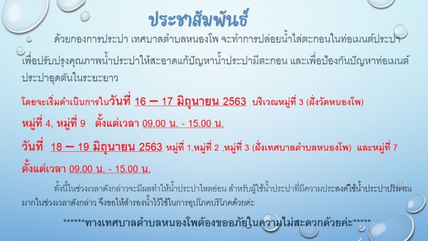 กองการประปา เทศบาลตำบลหนองโพ จะทำการปล่อยน้ำไล่ตะกอนในท่อเมนต์ประปา เดือน มิถุนายน 2563