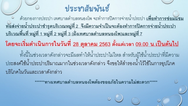 กองการประปา เทศบาลตำบลหนองโพ จะทำการปล่อยน้ำไล่ตะกอนในท่อเมนต์ประปา เดือน ตุลาคม 2563