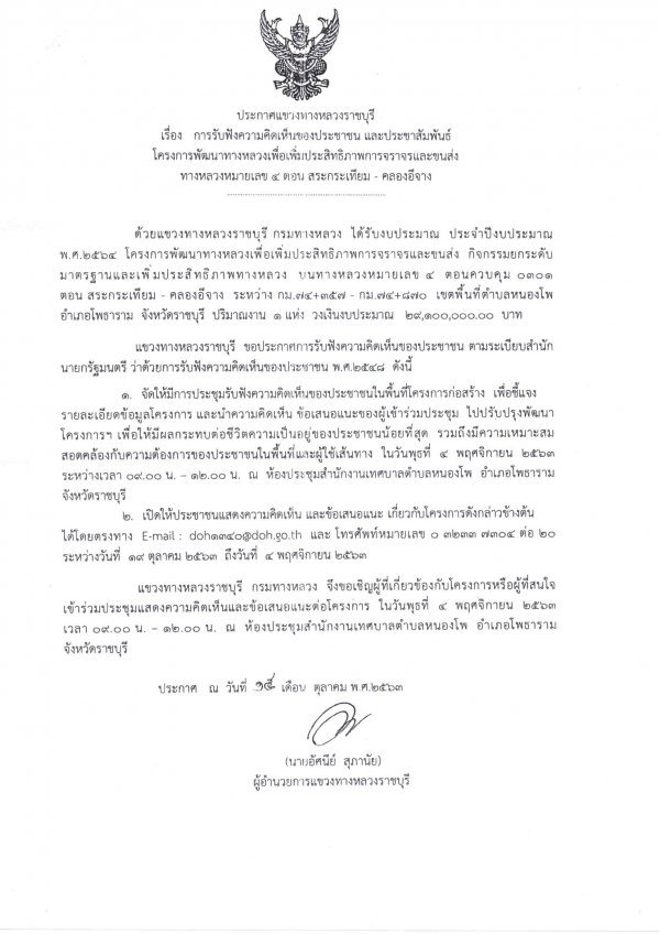 ประกาศแขวงทางหลวงราชบุรี เรื่อง การับฟังความคิดเห็นของประชาชน และประชาสัมพันธ์ โครงการพัฒนาทางหลวงเพื่อเพิ่มประสิทธิภาพการจราจรและขนส่งทางหลวงหมายเลข 4 ตอน สระกระเทียม-คลองอีจาง
