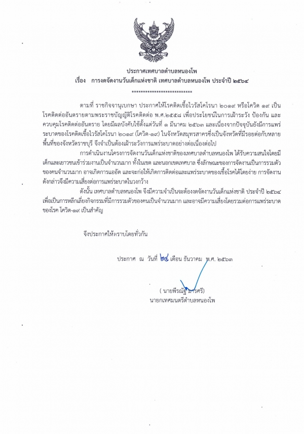 ประกาศเทศบาลตำบลหนองโพ เรื่อง การงดจัดงานวันเด็กแห่งชาติ เทศบาลตำบลหนองโพ ประจำปี 2564