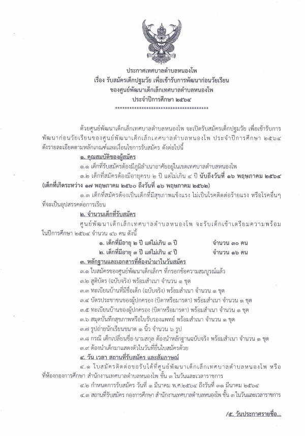 ประกาศเทศบาลตำบลหนองโพ เรื่อง รับสมัครเด็กปฐมวัย เพื่อเข้ารับการพัฒนาก่อนวัยเรียน ของศูนย์พัฒนาเด็กเล็กเทศบาลตำบลหนองโพ ประจำปีการศึกษา 2564