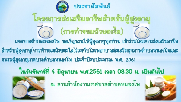 ขอเชิญชวนให้ผู้สูงอายุทุกท่าน เข้าร่วมโครงการส่งเสริมอาชีพสำหรับผู้สูงอายุ(การทำขนมถ้วยตะไล)ร่วมกับโรงพยาบาลส่งเสริมสุขภาพตำบลหนองโพและชมรมผู้สูงอายุเทศบาลตำบลหนองโพ ประจำปีงบประมาณ พ.ศ. 2561 ในวันจันทร์ที่ 4 มิถุนายน พ.ศ.2561 เวลา 08.30 น. เป็นต้นไป ณ ลานอเนกประสงค์สำนักงานเทศบาลตำบลหนองโพ