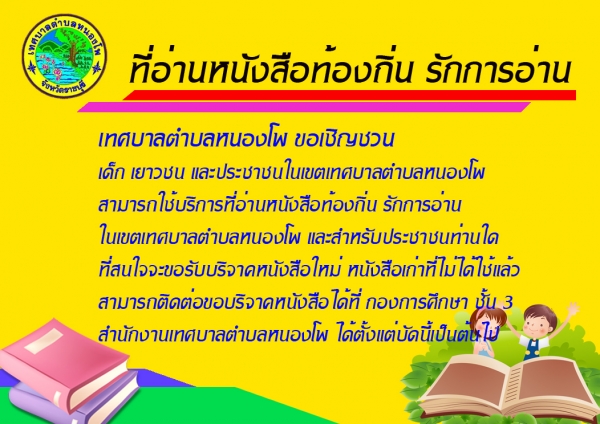 เทศบาลตำบลหนองโพ ขอเชิญชวนประชาชนทั่วไป สามารถใช้บริการที่อ่านหนังสือท้องถิ่น รักการอ่าน ได้ตามสถานที่ดังกล่าวข้างต้น และประชาชนที่สนใจจะขอรับบริจาค สามารถติดต่อขอบริจาคหนังสือได้ที่ กองการศึกษา เทศบาลตำบลหนองโพ