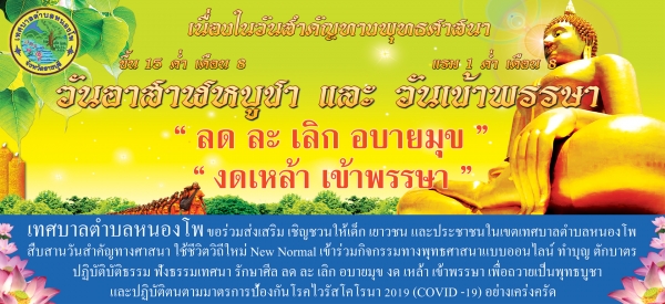 เนื่องในวันสำคัญทางศาสนาวันอาสาฬหบูชา ขึ้น 15 ค่ำ เดือน 8 ซึ่งตรงกับวันเสาร์ที่ 24 กรกฎาคม 2564 และวันเข้าพรรษา แรม 1 ค่ำ เดือน 8 ซึ่งตรงกับวันอาทิตย์ที่ 25 กรกฎาคม 2564 เทศบาลตำบลหนองโพ ขอร่วมส่งเสริม เชิญชวนให้ เด็ก เยาวชน และประชาชนในเขตเทศบาลตำบลหนองโพ มีส่วนร่วมในการส่งเสริม สืบสานประเพณีวันสำคัญทางศาสนา และทำนุบำรุงพระพุทธศาสนา ที่เป็นศาสนาประจำชาติไทย ใช้ชีวิตวิถีใหม่ New Normal ในการเข้าร่วมกิจกรรมทางพุทธศาสนาแบบออนไลน์ ทำบุญ ตักบาตร ปฏิบัติธรรม ฟังธรรมเทศนา รักษาศีล ลด ละ เลิก อบายมุข งดเหล้า เข้าพรรษา เพื่อถวายเป็นพุทธบูชา และปฏิบัติตนตามมาตรการป้องกัน โรคไวรัสโคโรน่า 2019 (Covid-19) อย่างเคร่งครัด และสามารถเข้าร่วมกิจกรรมทางพุทธศาสนาแบบออนไลน์ ได้ที่ www.เวียนเทียนออนไลน์.com