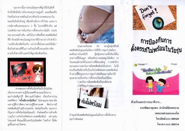 เทศบาลตำบลหนองโพ เล็งถึงความสำคัญของวัยรุ่นที่ควรได้รับบริการข้อมูลข่าวสารและความรู้รวมทั้งให้คำปรีกษาแก่วัยรุ่นด้านอนามัยการเจริญพันธ์และการป้องกันและแก้ไขปัญหาการตั้งครรภ์ในวัยรุ่น จึงจัดทำแผ่นพับประชาสัมพันธ์การป้องกันการตั้งครรภ์ไม่พร้อมในวัยรุ่น เพื่อให้รู้วิธีการป้องกันและควบคุมกำเนิดอย่างถูกวิธี หรือ โทร 1663 สายด่วยปรึกษาโรคเอดส์และท้องไม่พร้อม