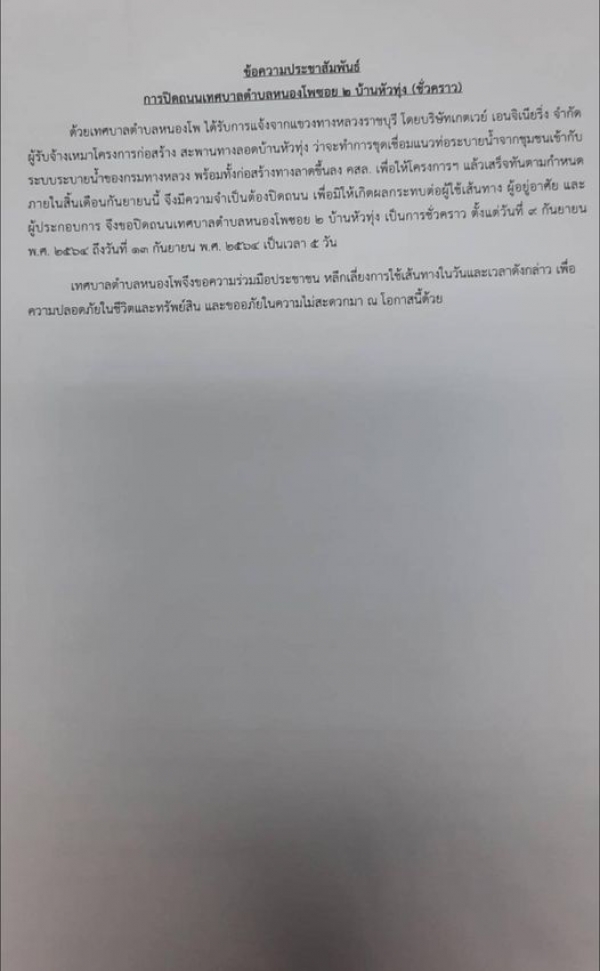 การปิดถนนเทศบาลตำบลหนองโพ ซอย 2 บ้านหัวทุ่ง ชั่วคราว