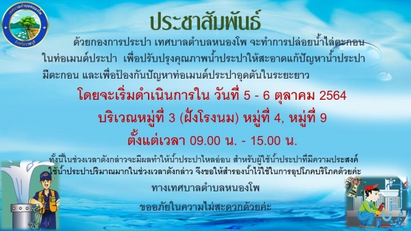 กองการประปา เทศบาลตำบลหนองโพ จะทำการปล่อยน้ำไล่ตะกอนในท่อเมนต์ประปา เดือน กันยายน 2564