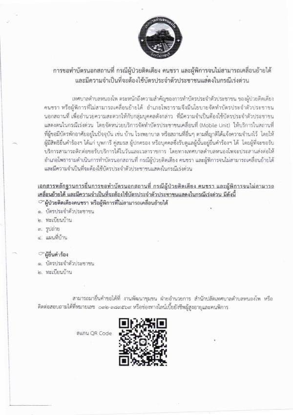 การขอทำบัตรนอกสถานที่ กรณีผู้ป่วยติดเตียง คนชรา และผู้พิการจนไม่สามารถเคลื่อนย้ายได้และมีความจำเป็นที่จะต้องใช้บัตรประจำตัวประชาชนแสดงตนในกรณีเร่งด่วน