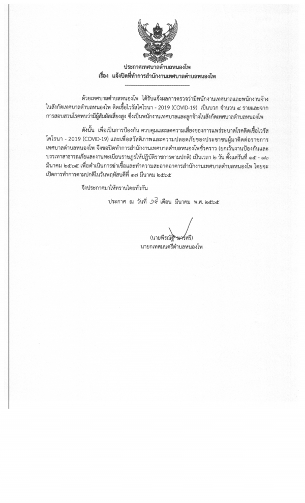 เพื่อเป็นการป้องกันควบคุมและลดความเสี่ยงของการแพร่ระบาดโรคติดเชื้อไวรัสโคโรนา-2019 (COVID-19 ) และเพื่อความปลอดภัยของประชาชนผู้ที่มาติดต่อราชการเทศบาลตำบลหนองโพ จึงขอปิดทำการสำนักงานเทศบาลตำบลหนองโพชั่วคราว เป็นเวลา 2 วัน ตั้งแต่วันที่ 15-16 มีนาคม 2565 เพื่อดำเนินการฆ่าเชื้อและทำความสะอาดอาคารสำนักงานเทศบาลตำบลหนองโพ