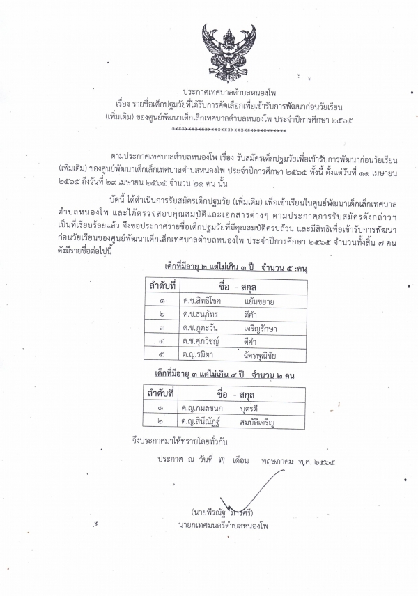 ประกาศเทศบาลตำบลหนองโพ เรื่อง รายชื่อเด็กปฐมวัยที่ได้รับการคัดเลือกเพื่อเข้ารับการพัฒนาก่อนวัยเรียน