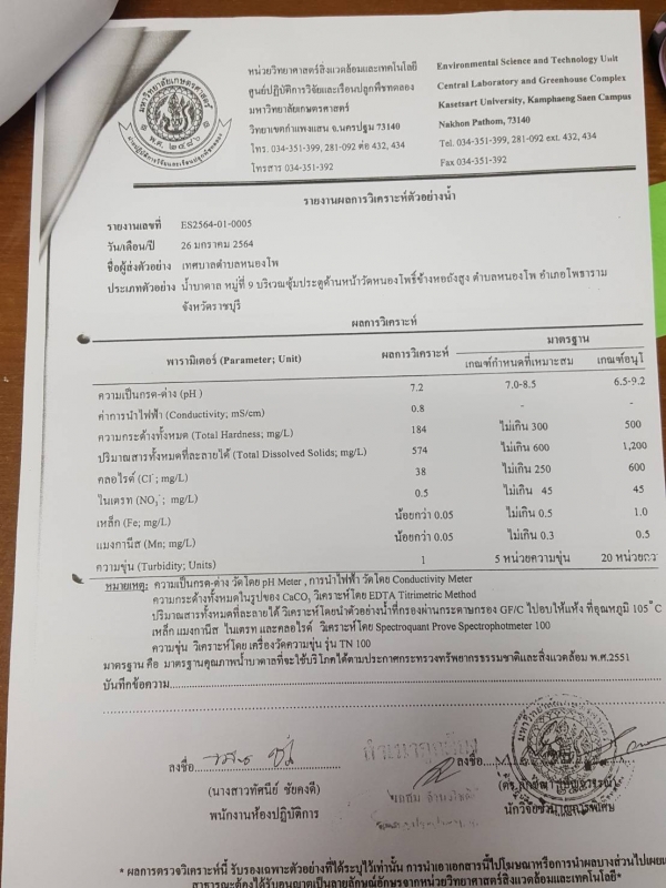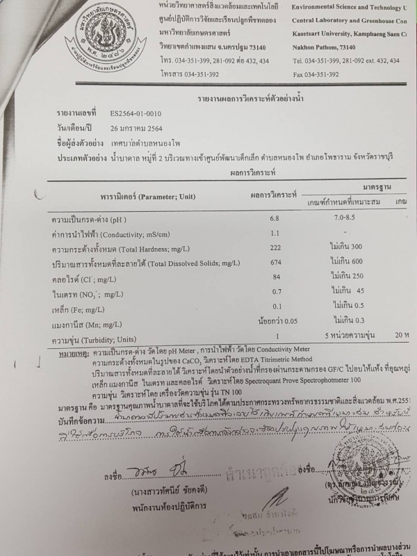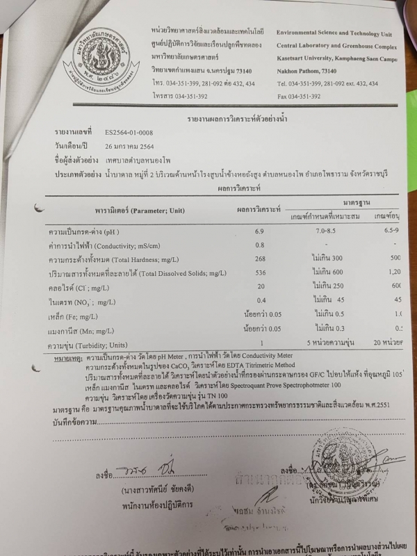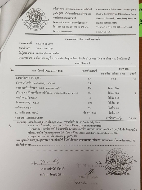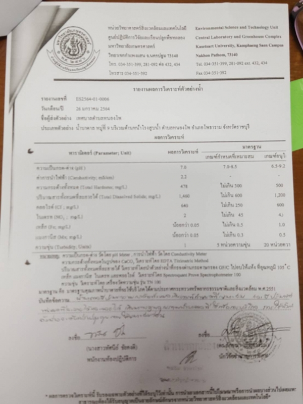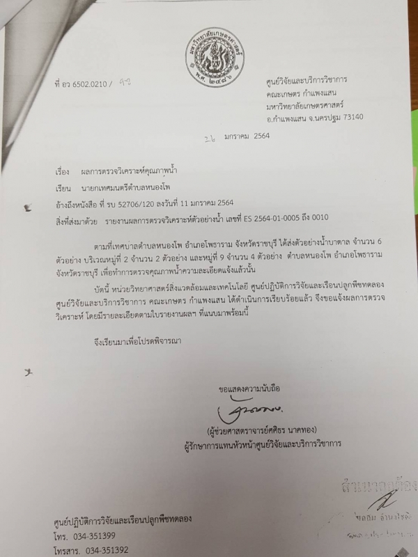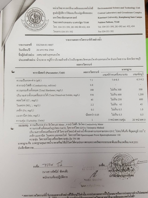 ประชาสัมพันธ์ จากศูนย์ปฏิบัติการวิจัยและเรือนปลูกพืชทดลอง แจ้งเรื่อง ผลการตรวจวิเคราะห์คุณภาพน้ำ