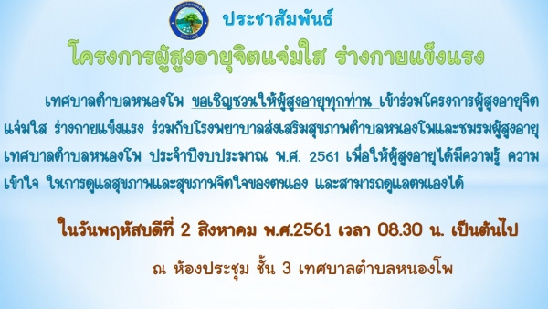 เทศบาลตำบลหนองโพ ขอเชิญชวนให้ผู้สูงอายุทุกท่าน เข้าร่วมโครงการผู้สูงอายุจิตแจ่มใส ร่างกายแข็งแรง ร่วมกับโรงพยาบาลส่งเสริมสุขภาพตำบลหนองโพและชมรมผู้สูงอายุเทศบาลตำบลหนองโพ ประจำปีงบประมาณ พ.ศ. 2561 เพื่อให้ผู้สูงอายุได้มีความรู้ ความเข้าใจ ในการดูแลสุขภาพและสุขภาพจิตใจของตนเอง และสามารถดูแลตนเองได้