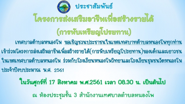 ขอเชิญชวนประชาชนในเขตเทศบาลตำบลหนองโพเข้าร่วมโครงการส่งเสริมอาชีพเพื่อสร้างรายได้(การพับเหรียญโปรยทาน) ประจำปีงบประมาณ พ.ศ. 2561