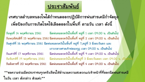 กำหนดออกปฏิบัติการพ่นสารเคมีกำจัดยุงเดือนพฤศจิกายน เพื่อป้องกันการเกิดโรคไข้เลือดออกในพื้นที่เขตเทศบาลตำบลหนองโพ