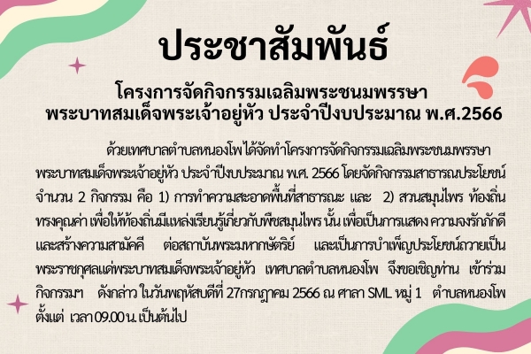 เพื่อเป็นการแสดงความจงรักภักดี และสร้างความสามัคคี ต่อสถาบันพระมหากษัตริย์ และเป็นการบำเพ็ญประโยชน์ถวายเป็นพระราชกุศลแด่พระบาทสมเด็จพระเจ้าอยู่หัว เทศบาลตำบลหนองโพ จึงขอเชิญท่านเข้าร่วมกิจกรรมฯ ดังกล่าว ในวันพฤหัสบดีที่ 27 กรกฎาคม 2566 ณ ศาลา SML หมู่ 1 ตำบลหนองโพ ตั้งแต่เวลา 09.00 น. เป็นต้นไป