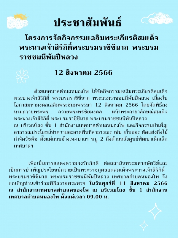 ประชาสัมพันธ์ โครงการจัดกิจกรรมเฉลิมพระเกียรติสมเด็จพระนางเจ้าสิริกิติ์พระบรมราชิชีนาถ พระบรมราชชนนีพันปีหลวง12 สิงหาคม 2566