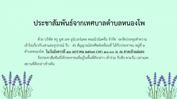 ประชาสัมพันธ์การจัดประชุมทำความเข้าใจเกี่ยวกับเสาและอุปกรณ์ รับ - ส่ง สัญญาณโทรศัพท์เคลื่อนที่ ให้กับประชาชน หมู่ที่ 2 ตำบลหนองโพ