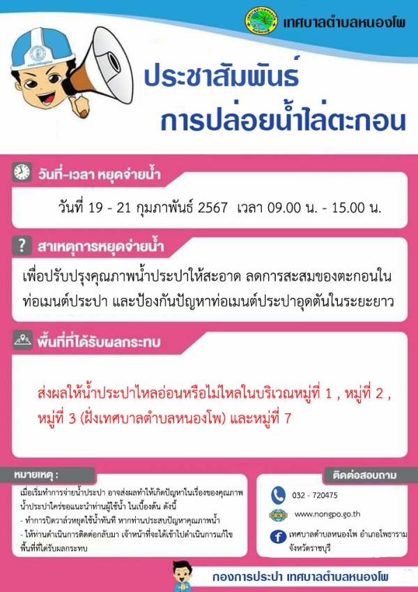 ด้วยกองการประปา เทศบาลตำบลหนองโพ จะทำการปล่อยน้ำไล่ตะกอนในท่อเมนต์ประปา เพื่อเป็นการปรับปรุงคุณภาพน้ำประปาให้สะอาด ลดการสะสมของตะกอนในท่อเมนต์ประปา และป้องกันปัญหาท่อเมนต์ประปาอุดตันในระยะยาว โดยจะเริ่มดำเนินการ ในวันที่ 19 - 21 กุมภาพันธ์ พ.ศ.2567 บริเวณหมู่ที่ 1 หมู่ที่ 2 หมู่ที่ 3 (ฝั่งเทศบาลตำบลหนองโพ) และหมู่ที่ 7 โดยจะเริ่มดำเนินการตั้งแต่เวลา 09.00 น. - 15.00 น.