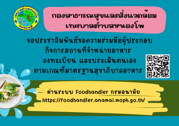 กองสาธารณสุขและสิ่งแวดล้อม ขอประชาสัมพันธ์ขอความร่วมมือผู้ประกอบการกิจการสถานที่จำหน่ายอาหารลงทะเบียน และประเมินตนเองตามเกณฑ์มาตรฐานสุขาภิบาลอาหารผ่านระบบ Foodhandler กรมอนามัย (https://foodhandler.anamai.moph.go.th)