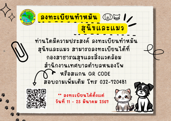 กองสาธารณสุขและสิ่งแวดล้อม ขอประชาสัมพันธ์ กำหนดการออกหน่วยบริการฉีดวัคซีนป้องกันโรคพิษสุนัชบ้า และรับลงทะเบียนทำหมันสุนัขและแมวในพื้นที่เทศบาลตำบลหนองโพ เพื่อป้องกันการแพร่ระบาดของโรคพิษสุนัขบ้า และควบคุมประชากรสุนัขและแมวในพื้นที่ ในระหว่างวันที่ 11 - 25 มีนาคม 2567