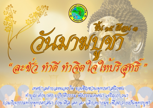เนื่องในวัน มาฆบูชา ขึ้น 15 ค่ำ เดือน 3 ซึ่งตรงกับวันที่ 19 กุมภาพันธ์ พ.ศ. 2562 กองการศึกษา เทศบาลตำบลหนองโพ กำหนดจัดทำโครงการส่งเสริมประชาสัมพันธ์ วันมาฆบูชา ประจำปี พ.ศ.2562 ในระหว่างวันที่ 13-19 กุมภาพันธ์ 2562 เพื่อเป็นการเชิญชวนให้ เด็ก เยาวชน และประชาชน ได้ตระหนักถึงความสำคัญ และการมีส่วนร่วมในการส่งเสิรม สืบสาน วันสำคัญทางพระพุทธศาสนา วันมาฆบูชา ทำบุญ ตักบาตร ปฏิบัติธรรม ฟังธรรมเทศนา เจริญภาวนา ร่วมแสดงตนเป็นพุทธมามกะ และเข้าร่วมกิจกรรมทางพุทธศาสนา รักษาศีล ลด ละ เลิก อยายมุข เพื่อถวานเป็นพุทธบูชา ในวันสำคัญทางศาสนา
