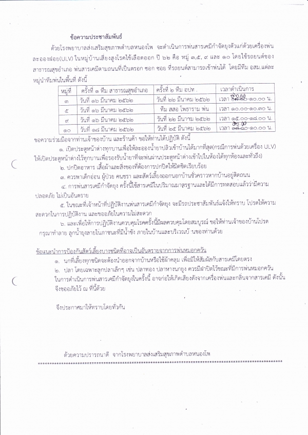 โรงพยาบาลส่งเสริมสุขภาพตำบลหนองโพ จะดำเนินการพ่นสารเคมีกำจัดยุงตัวแก่ด้วยเครื่องพ่นละอองฝอย(ULV)