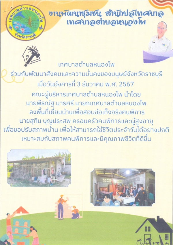 การลงพื้นที่เยี่ยมบ้านเพื่อสอบข้อเท็จจริงคนพิการ นายสุทิน บุญประสพ ร่วกับพัฒนาสังคมและความมั่นคงของมนุษย์จังหวัดราชบุรี เพื่อขอปรับสภาพบ้านฯ