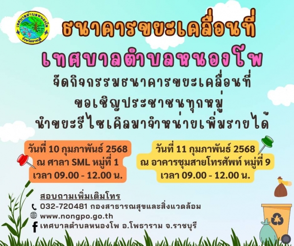 กองสาธารณสุขและสิ่งแวดล้อม เทสบาลตำบลหนองโพ ขอเชิญประชาชนทุกหมู่บ้าน นำขยะรีไซเคิลมาจำหน่ายเพิ่มรายได้